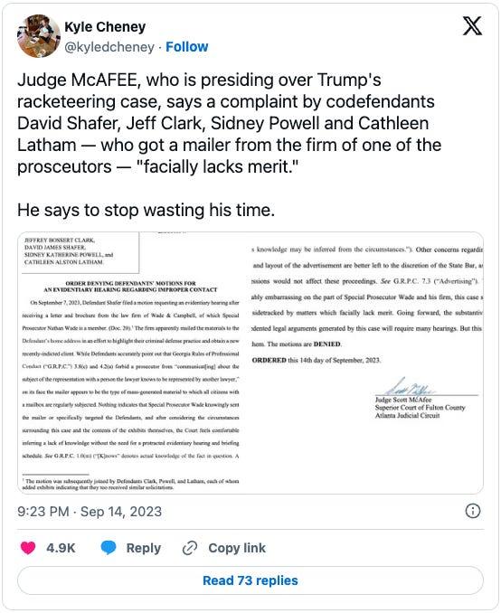 The state judge handling the big RICO case made official yesterday what he had signaled the week before: Ken Chesebro and Sidney Powell and any other defendant who invokes their right to a speedy trial will go to trial next month, and the remaining defendants will be tried separately down the road. That means Trump avoids an October trial in Atlanta.