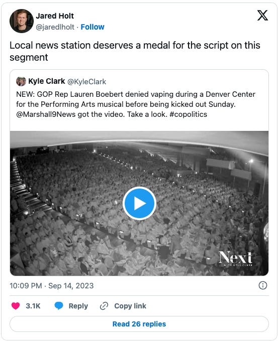 Yesterday’s Morning Memo included a montage of surveillance video of Rep. Lauren Boebert (R-CO) making a spectacle of herself at a performance of the Beetlejuice musical in Denver – but you really need to watch it with this voiceover: