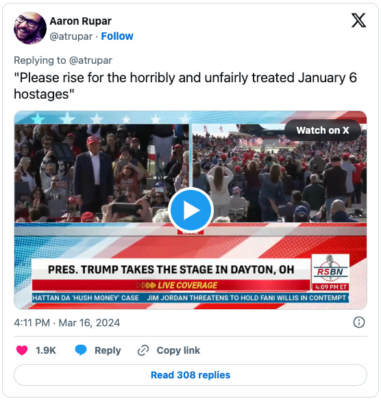 The “J6 anthem” is now routine at Trump events, coupled with Trump assurances that he will immediately pardon what he calls the Jan. 6 “hostages”: