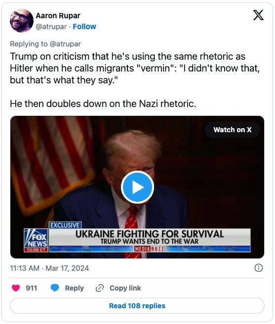 Trump casually engaged in dehumanizing rhetoric, threats of violence, vows of retribution, and unhinged commentary. Nothing new, you say? Perhaps. But at this point if you can no longer register alarm for the country or for yourself, muster it for those who are and will be direct targets of Trump’s fantasies of revenge and systemic violence. In the meantime, what are we left to do if not document day by day, step by step the rapid descent into madness that Trump promises in a second term?