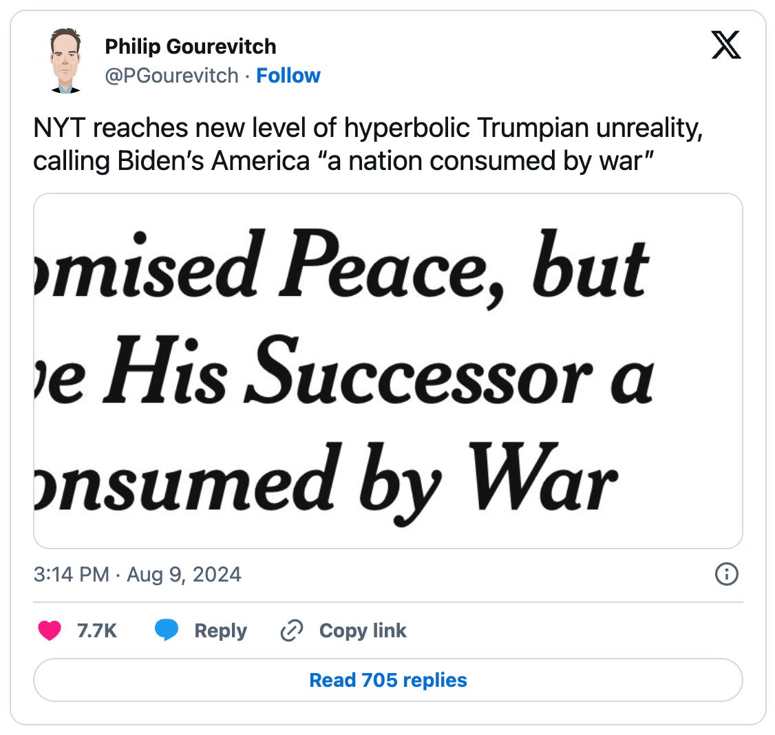 The revised version currently still live is “Biden Promised Peace, but Will Leave His Successor a Nation Entangled in War.”