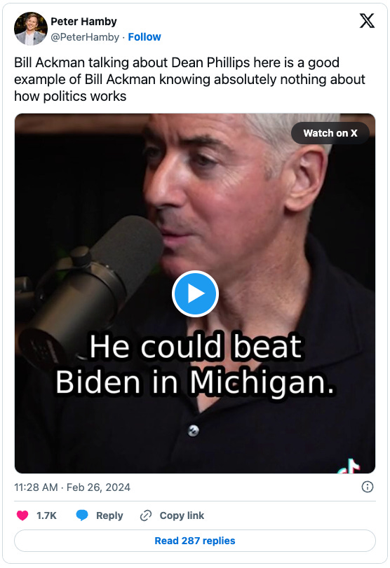 Why do wealthy people think that others want to listen to everything they say? Why would anyone want or need to hear Ackman comment on Biden and Phillips? Media at work...