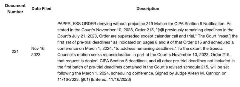 The docket entry is not clarion call by any means. It’s technical and legalistic. A perfect way to bury the reality of acceding to Trump’s delay strategy. But the consensus among CIPA experts and legal observers is that this is best evidence yet that Cannon is slow-rolling the case, to Trump’s benefit.