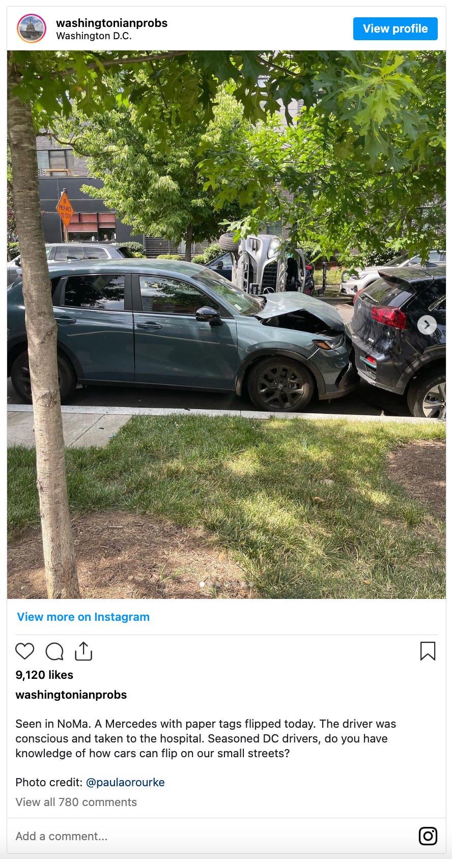 It was how I found out about the collision that still has me shaking my head. I had finished up my TPM work day and was getting ready to go work out when I happened to check Instagram. The top post was from a popular DC account that offers a buzzy and usually funny snapshot of urban life here … pause … wait, that’s MY car.