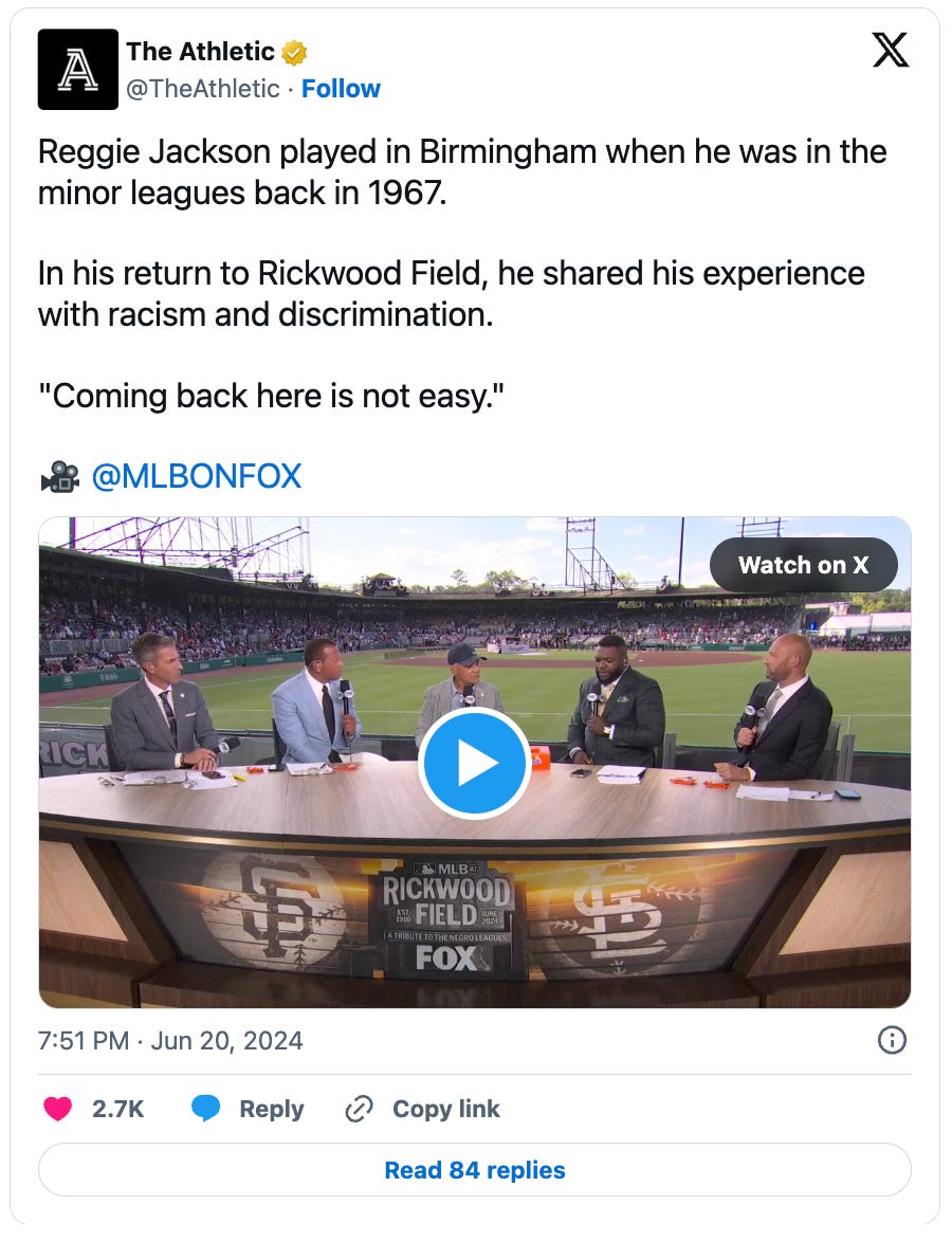 I'd planned to watch this game because of various reasons: Willie Mays, we've visited Rickwood Field some years back, I'm a baseball fan, I can't watch the Braves now, yada, yada. Anyway, finally, did see Reggie Jackson, but in the booth about the 4th inning. This is the history that Republicans don't want students to learn. Thanks, Reggie for saying this💔❤️💔🤐