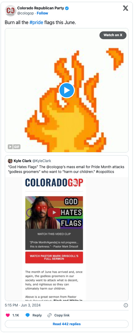 While Martha Alito was complaining about having to look at the Pride flag this month, the aggressively far-right Colorado Republican Party was urging its members to burn it: