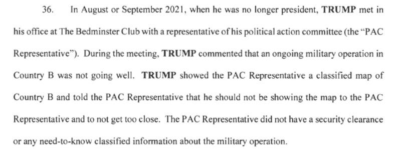 At issue was an episode described in the indictment at Trump’s Bedminster club where he showed a representative of his PAC – widely reported to be Susie Wiles, who is now a Trump campaign adviser – a classified map: