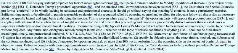 Cannon insisted that prosecutors had not sufficiently conferred with the defense team before filing and ordered that all future filings contain a statement of no more than 200 words by the opposing side of its position.