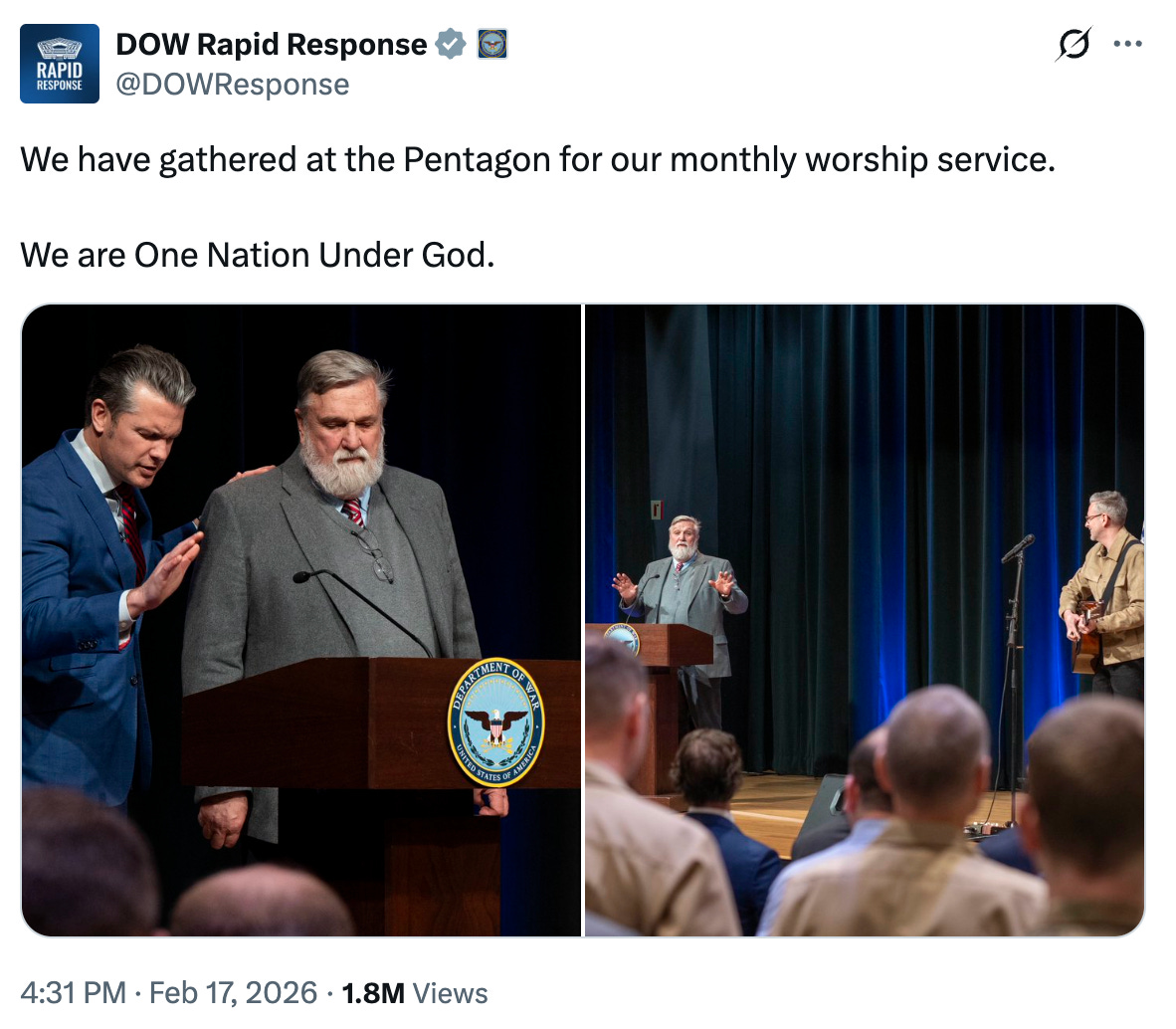 Defense Secretary Pete Hegseth invited Christian nationalist pastor Doug Wilson to lead a worship service at the Pentagon, which promptly posted about it: