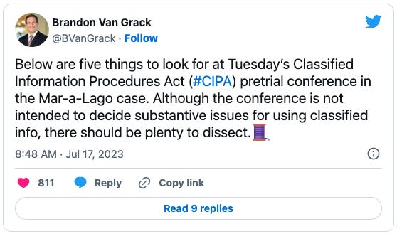 We may not get a ruling today: It’s possible Cannon will rule from the bench on a trial date and CIPA schedule. However, my expectation is that we’ll get clues from her as to how she will rule, but we won’t get an actual ruling until sometime after the hearing. My best guess would be later today or tomorrow.
