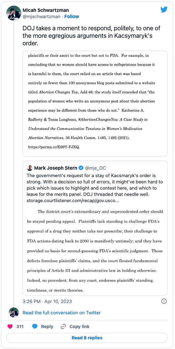 I don’t mean bad in the sense of wrong on the standing issue, or the administrative law issues, or the timeliness issue (the FDA approved the drug TWO decades ago). All that too! But bad in a way that exposes the foundational corruptness of Kacsmaryk’s approach.