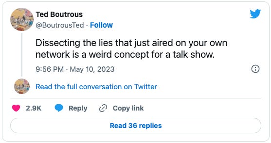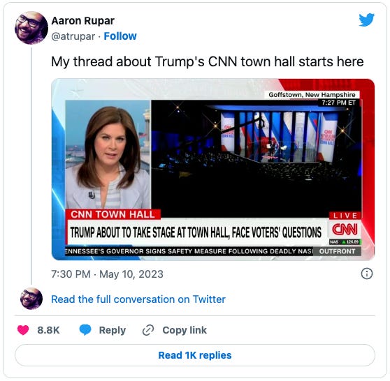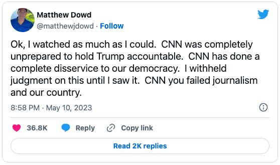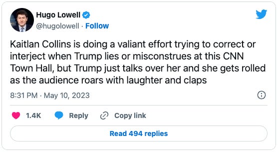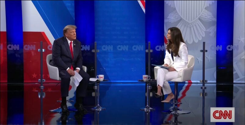 The culprit here wasn’t Kaitlan Collins, who was hopelessly hamstrung by the format. The culprit is the CNN honchoes trying to repair its imagined breach with conservative viewers (or is it “its breach with imagined conservative viewers”?). The format doomed the interview from the start. It was a public disservice, a journalistic failure, and repeat of the fundamental misunderstanding of how to cover Trump that has plagued the civic square for going on almost a decade now.