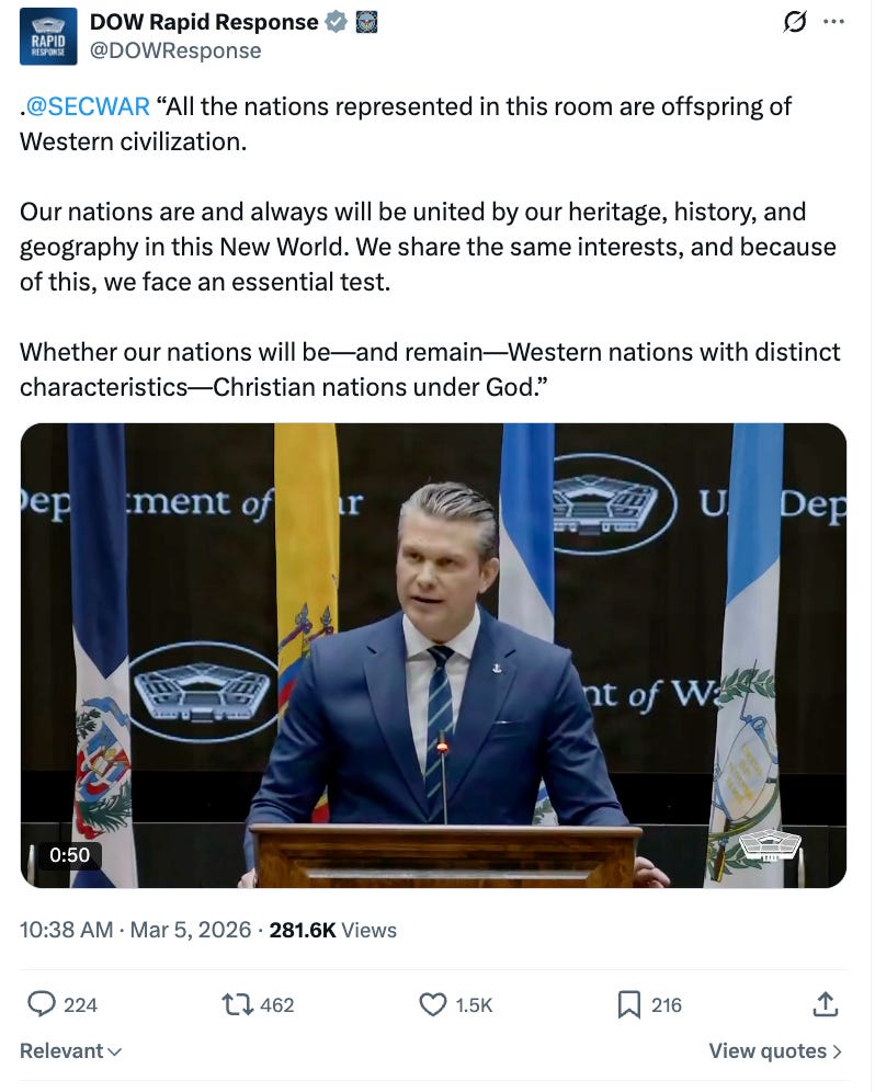 Addressing representative of countries in the Western Hemisphere yesterday, Defense Secretary Pete Hegseth let his white nationalist flag fly: