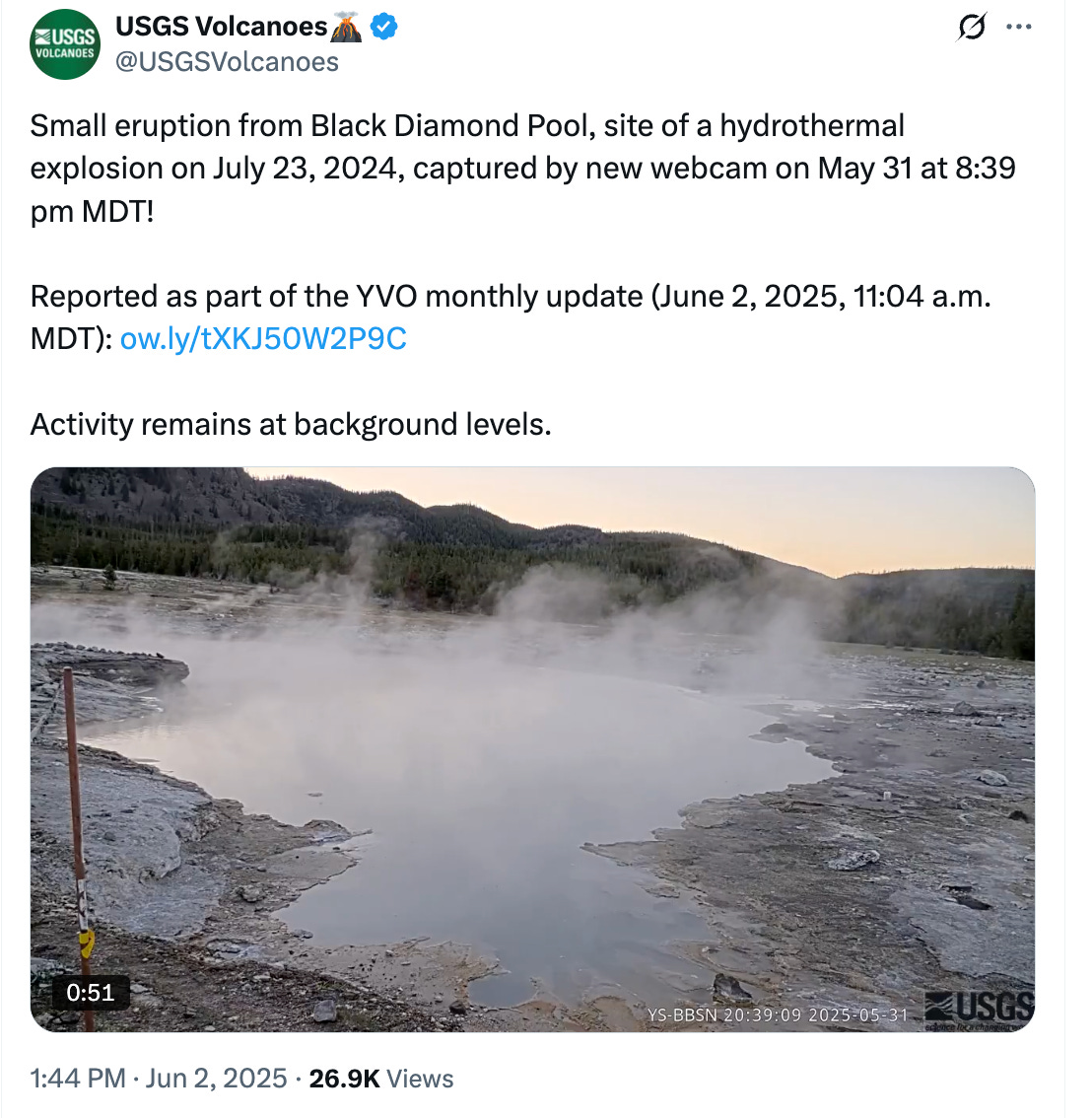 The first eruption from Yellowstone’s Black Diamond Pool captured on video since last summer’s much larger hydrothermal explosion: