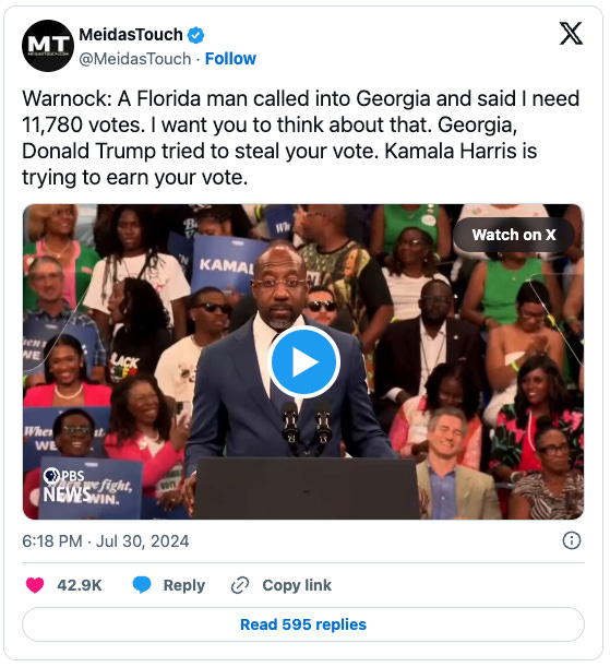 Kamala Harris held a raucous rally Tuesday night in Atlanta, where Sen. Raphael Warnock (D-GA) had the crowd eating from his hand: