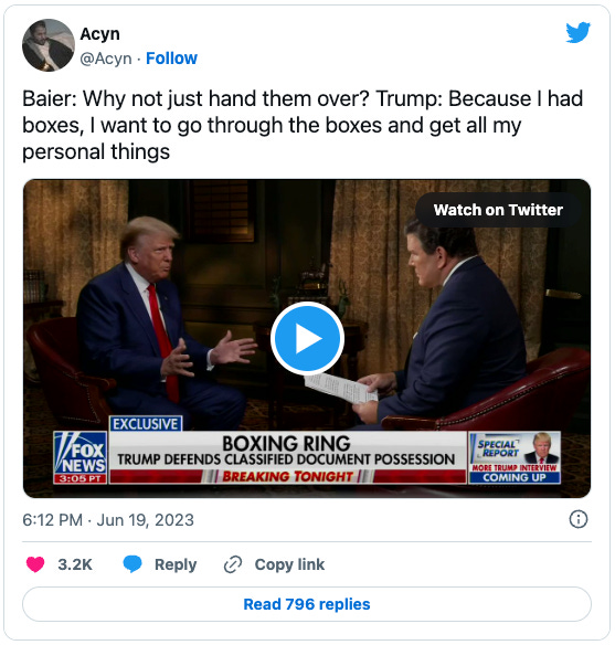 The last Morning Memo before this one was devoted to Trump’s ongoing public confessions of his Mar-a-Lago criming. He can’t stop. Won’t stop. In part one of a two-part interview, the second of which has yet to air, Trump told Fox News’ Bret Baier: