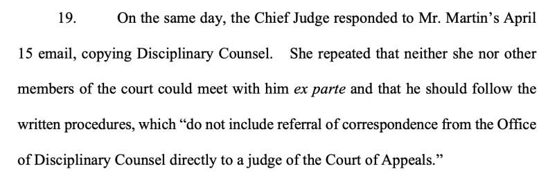 A week later, Martin cc’ed the chief judge on an email to the disciplinary counsel, which earned him another admonishment from the chief judge: