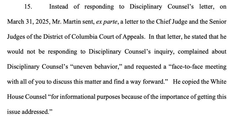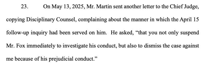 A month later, after allegedly failing to respond to communications from the disciplinary counsel, Martin sent yet another letter to the chief judge, now taking aim at the disciplinary counsel himself: