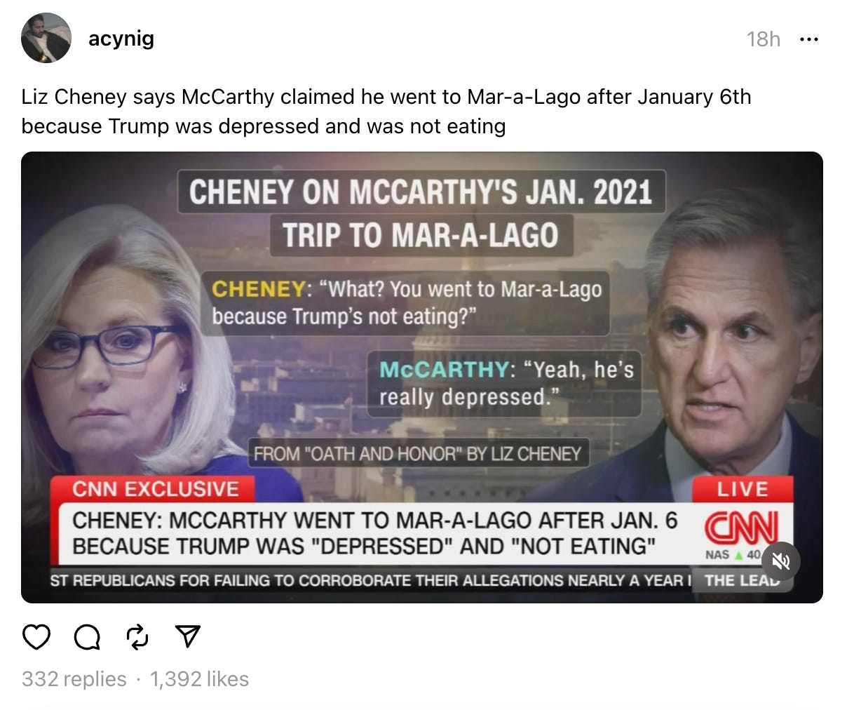 Former Rep. Liz Cheney’s new book includes her account of this bonkers exchange with Rep. Kevin McCarthy (R-CA) on his post-Jan. 6 pilgrimage to Mar-a-Lago: