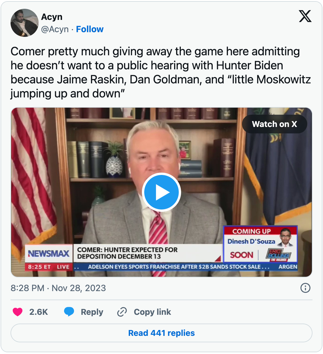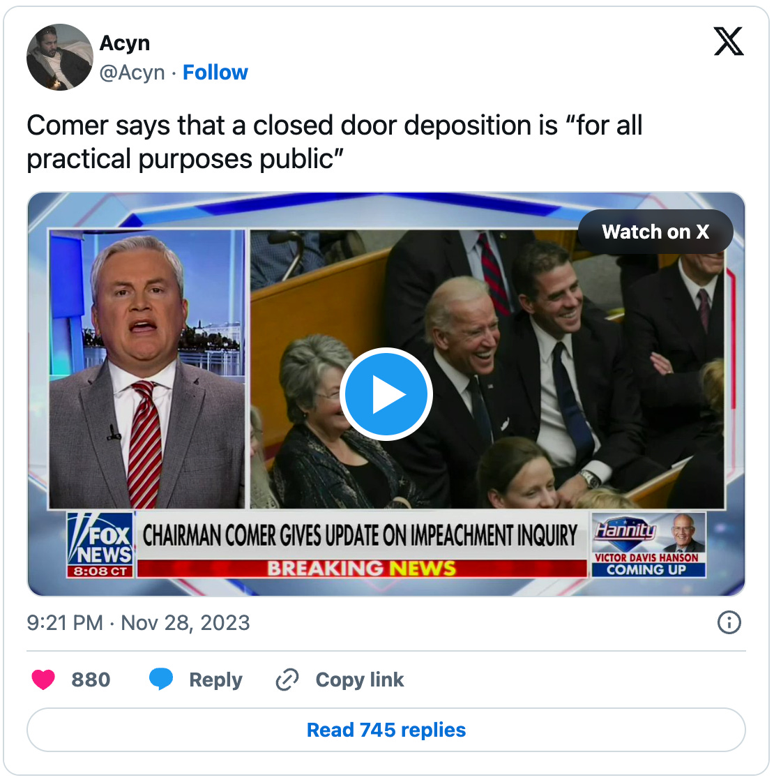 If that wasn’t good enough, here’s Comer pretending it’s all public anyway (which could make it harder to negotiate future “private” sit-downs with the committee since they’re not really private):