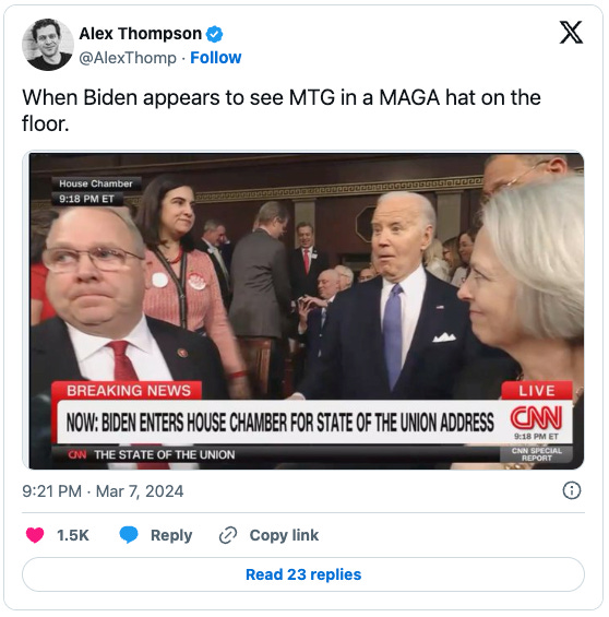 They were left spluttering that Biden’s State of the Union was too loud and too campaign-y. They couldn’t maintain a basic level of decorum in the chamber, giving Biden the chance to knock them around with ad libs and direct call outs, directly facing the GOP side of the chamber. He turned the call and response of the Black church into whack-a-MTG.