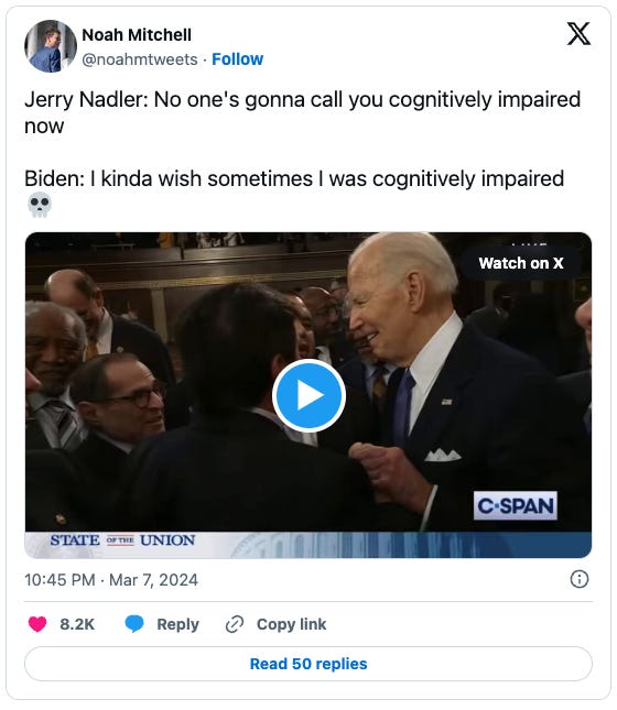LOVED your headline: "GOP Stunned to Discover It's Not Running Against a Cadaver in 2024"! Perfect and my sentiments too as I watched last night. Great collection this morning, as usual. Thanks David!