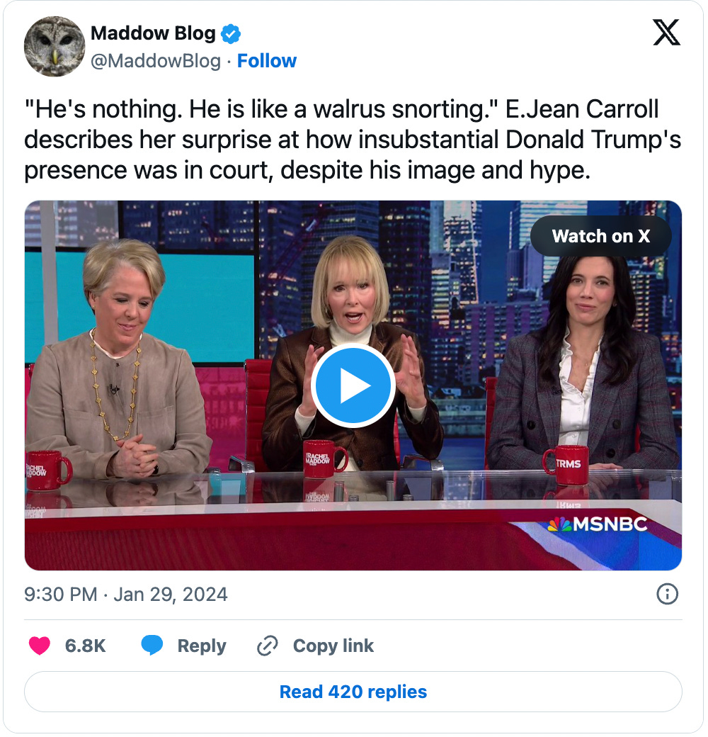 E. Jean Carroll made the rounds on TV yesterday, basking in her $83 million judgment against Donald Trump: