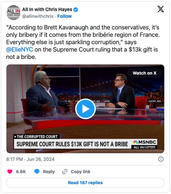 In yesterday’s other Supreme Court decision, it ruled that federal law distinguished between bribery (illegal) and after-the-fact gratuities to reward prior actions (not illegal). The court, consistent with its decade-long pattern of antipathy towards anti-public corruption statutes, opened a hole in the law big enough to drive an armored car full of goodies through. But let me yield to Elie Mystal on this: