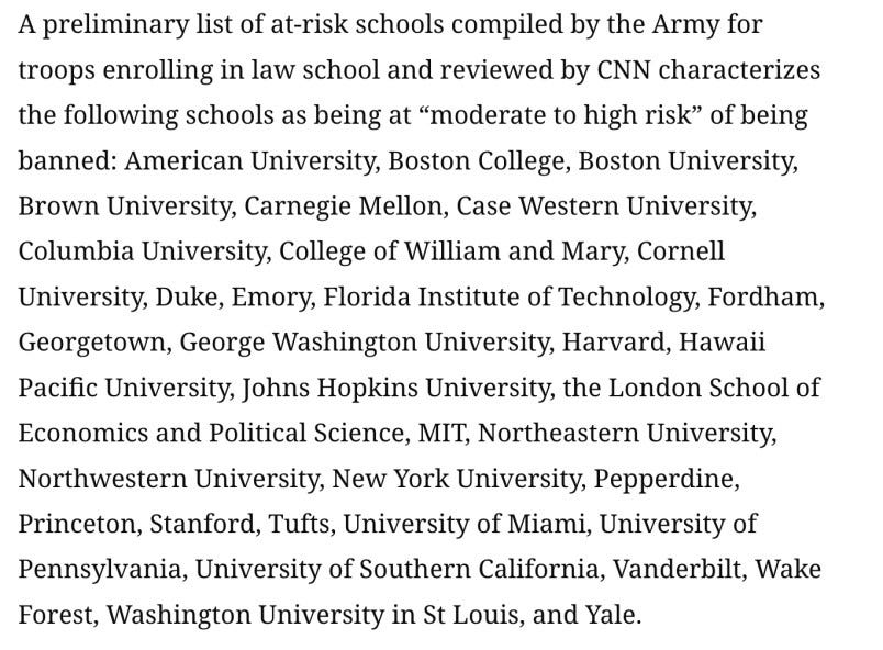 Nationwide: Defense Secretary Pete Hegseth is creating a list of top universities that will no longer be eligible for tuition assistance for service members because they are “biased,” CNN reports: