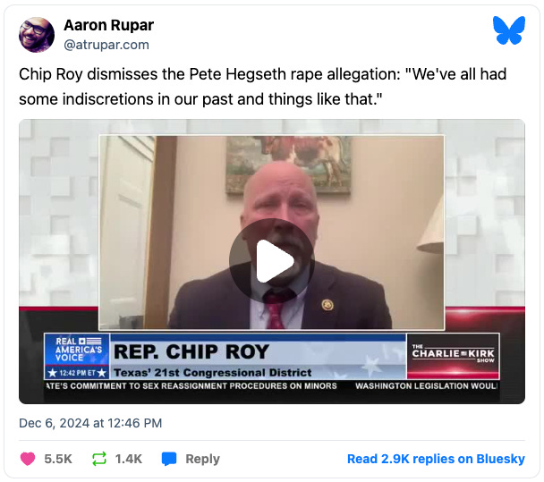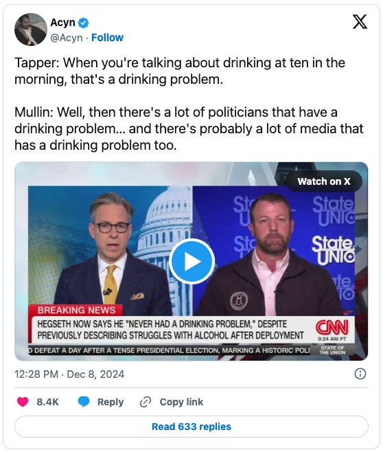 Meanwhile, Kevin Roberts, the head of the Heritage Foundation and incubator of Project 2025, is pledging to spend $1 million to pressure reluctant GOP senators to support the Hegseth nomination. (That’s not really much money, to be honest.)