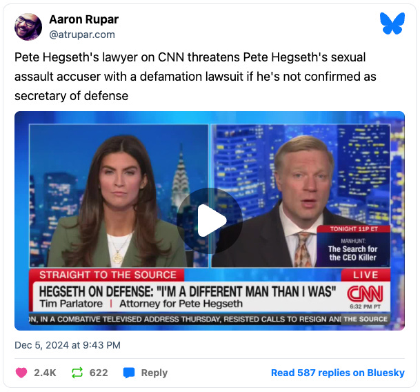 Hegseth is threatening a “civil extortion claim” against his sexual assault accuser if he is not confirmed as defense secretary: