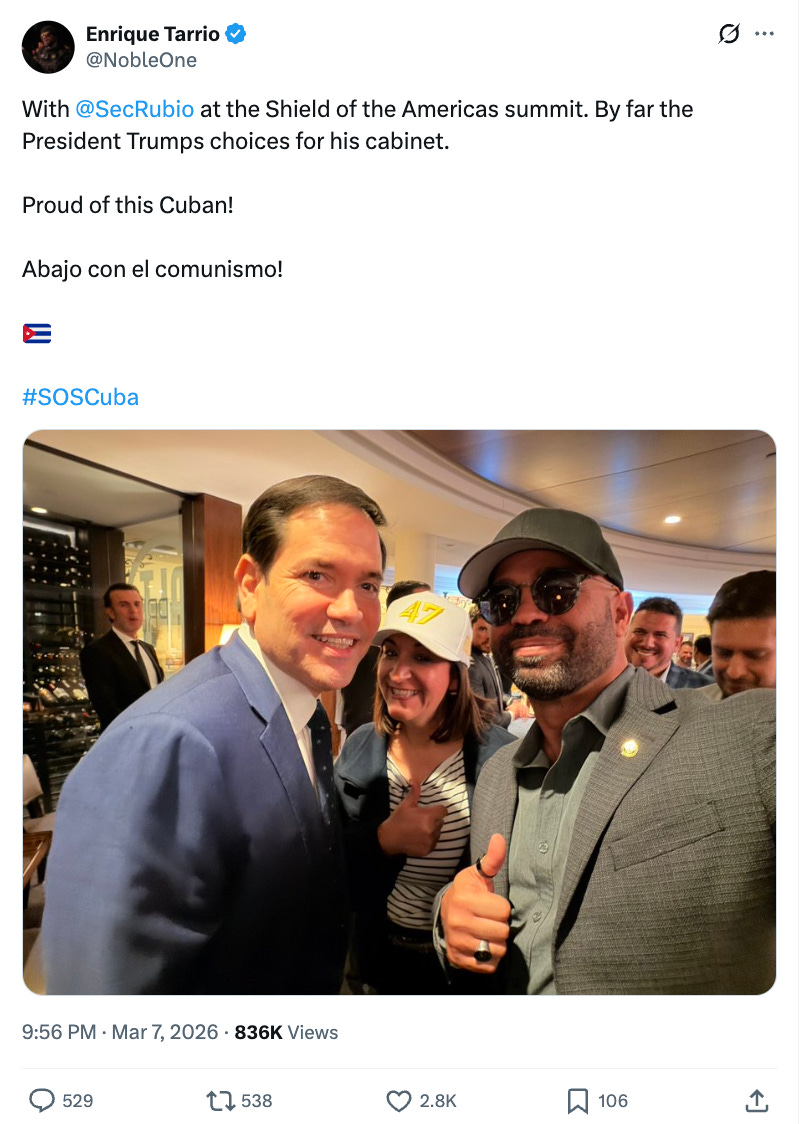 Former Proud Boy leader Enrique Tarrio, convicted of sedition for his role in the Jan. 6 attack before being pardoned by President Trump, pals around with Secretary of State Marco Rubio, the future viceroy of Cuba (both share Cuban ancestry):