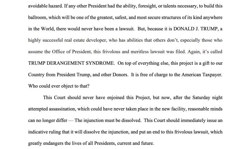 It goes on like this for two pages, much of it devoted to leveraging Saturday night’s assassination attempt into a new justification for the ballroom, before turning to anything that purports to be actual legal arguments.