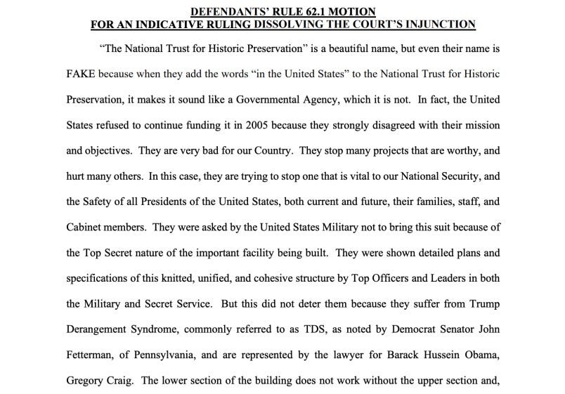That seems to be the line we crossed last night with a new filing in the vanity ballroom case that reads like a Trump Truth Social post or one of those interminable digressions in his two-hour campaign speeches.