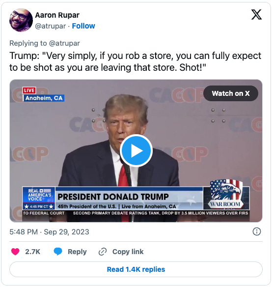 That was probably the most egregious moment in the speech, but it was sheer madness throughout, like King George III level madness. Just scroll through Aaron Rupar’s running clips here to get a better sense of what 2024 and beyond could hold.