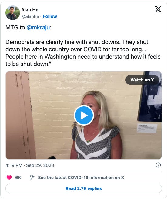 Welp, we went into the weekend facing the prospect of potentially long government shutdown, with no obvious resolution in sight. But by Saturday afternoon, Speaker Kevin McCarthy said fuck it and rolled over his right-wing flank with Democratic support to pass a 45-day continuing resolution to fund the government while negotiations on a long-term budget deal proceed.