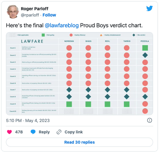 The big unknown coming out of the trial is whether the Proud Boys convictions pave the way for prosecutors to connect the Capitol attack to the White House or to Trump or to those in his inner circle. More on that to come.
