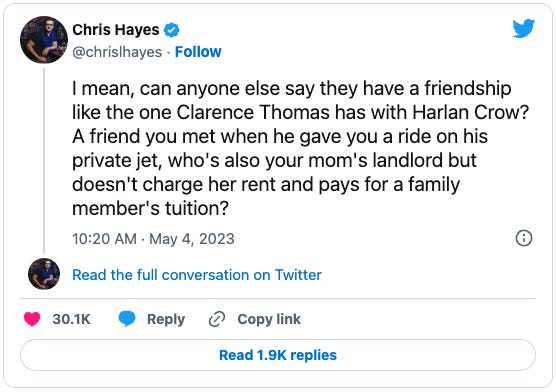A Remarkable Statement. The Thomas camp issued the following statement in response to the separate ProPublica report that billionaire GOP donor Harlan Crow paid the private school tuition of Thomas’ grandnephew. I’ll put it here in full as an historical artifact: