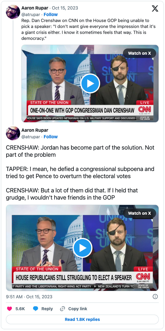 It’s hard for me not to assume that Jordan will find a way to pull it off, not because it’s a clear or obvious path to victory for him, but because the alternative for the GOP and the country seems absolutely insane: a speakerless House for a long stretch leading to political paralysis.