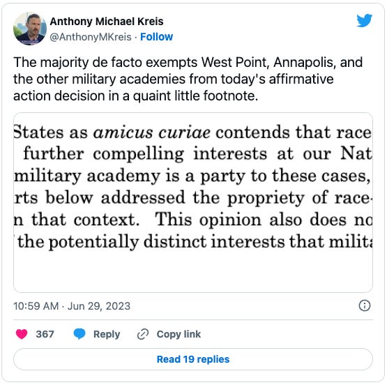 One footnote to the majority opinion serves to undermine the whole enterprise. The service academies are essentially exempt from the new no-affirmative action rule: