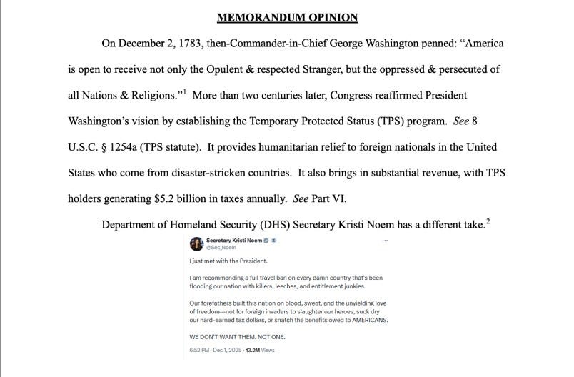 Kristi Noem has a First Amendment right to call immigrants killers, leeches, entitlement junkies, and any other inapt name she wants. Secretary Noem, however, is constrained by both our Constitution and the APA to apply faithfully the facts to the law in implementing the TPS program. The record to-date shows she has yet to do that.