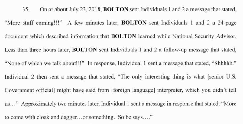 In addition, Bolton comes off in the indictment as downright dumb in additional to careless and even reckless in how he allegedly handled classified information, sharing while Trump’s national security adviser more than 1,000 pages of “diary-like” entries with two family members, reported by the WSJ to be his wife and daughter. This alleged exchange is peak WTF: