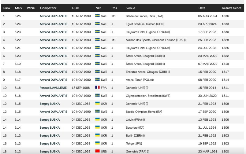 To give you some sense of Mondo Duplantis‘ domination of pole vaulting, here are the top vaults (click “All” next to “Best by Athlete”) ever recorded: