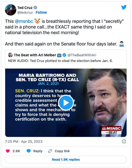 Grossberg’s lawyers provided MSNBC’s Ari Melber with audio recordings she made of Ted Cruz talking to her and Bartiromo just days before Jan. 6. Melber had a field day with it last night on his show: