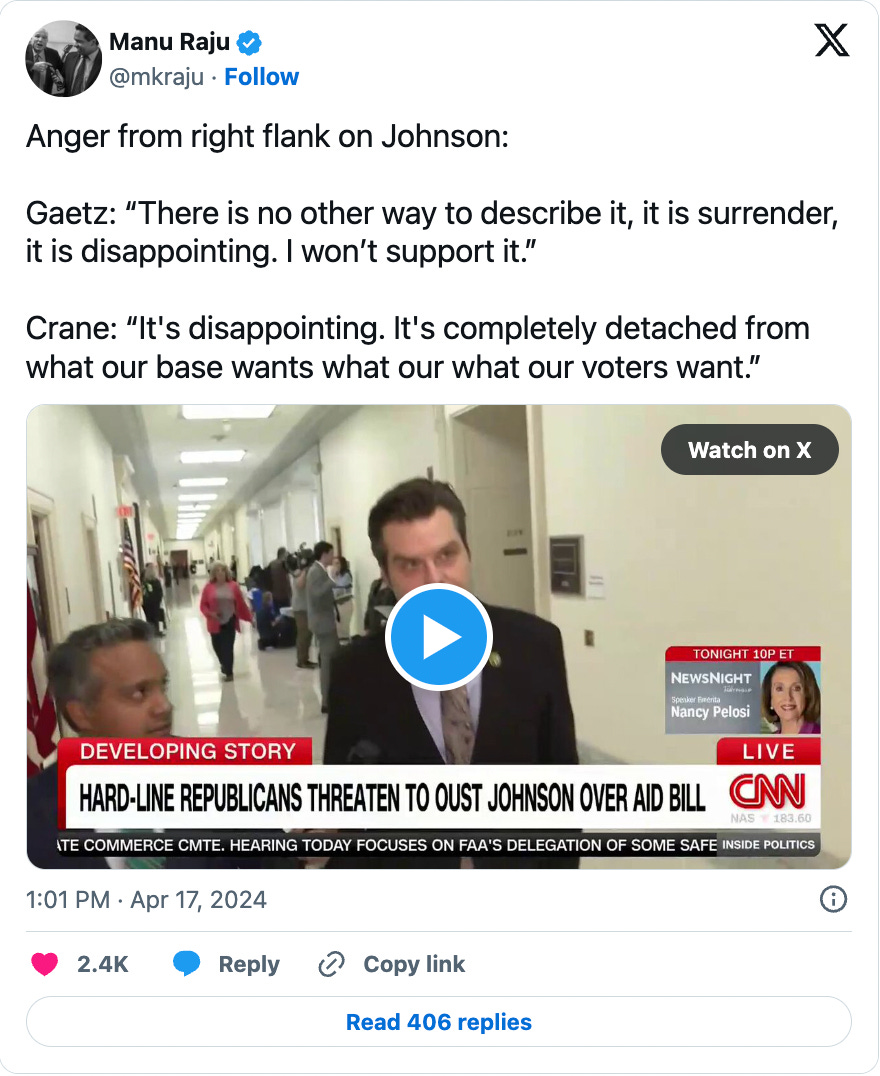 Gaetz called Johnson’s decision to move forward on Ukraine aid an “abject surrender”: