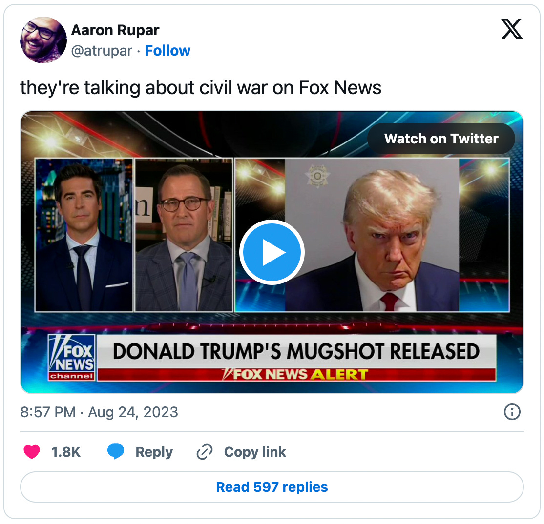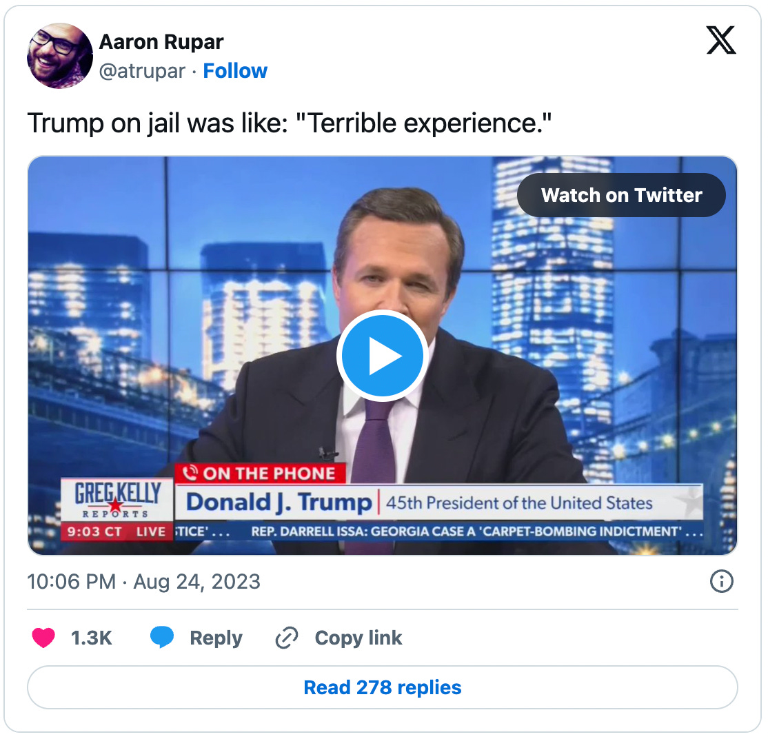 In the Aaron Rupar post of the phone interview, tfg says he's never heard of a mugshot?! Because that's not the sort of thing you hear about at the Wharton school of business. Right.... His pathetic lizard brain is working overtime to spin every aspect of what's happening to him.