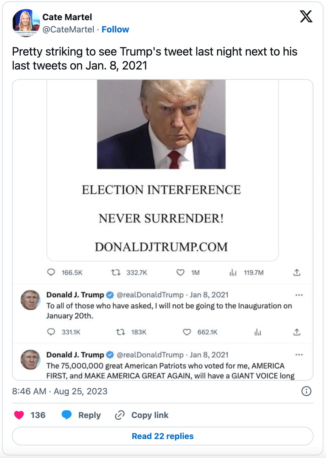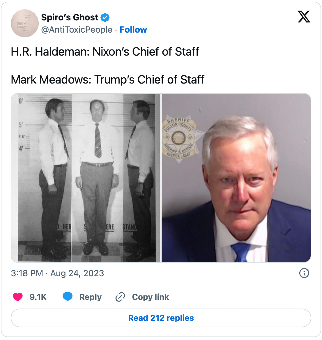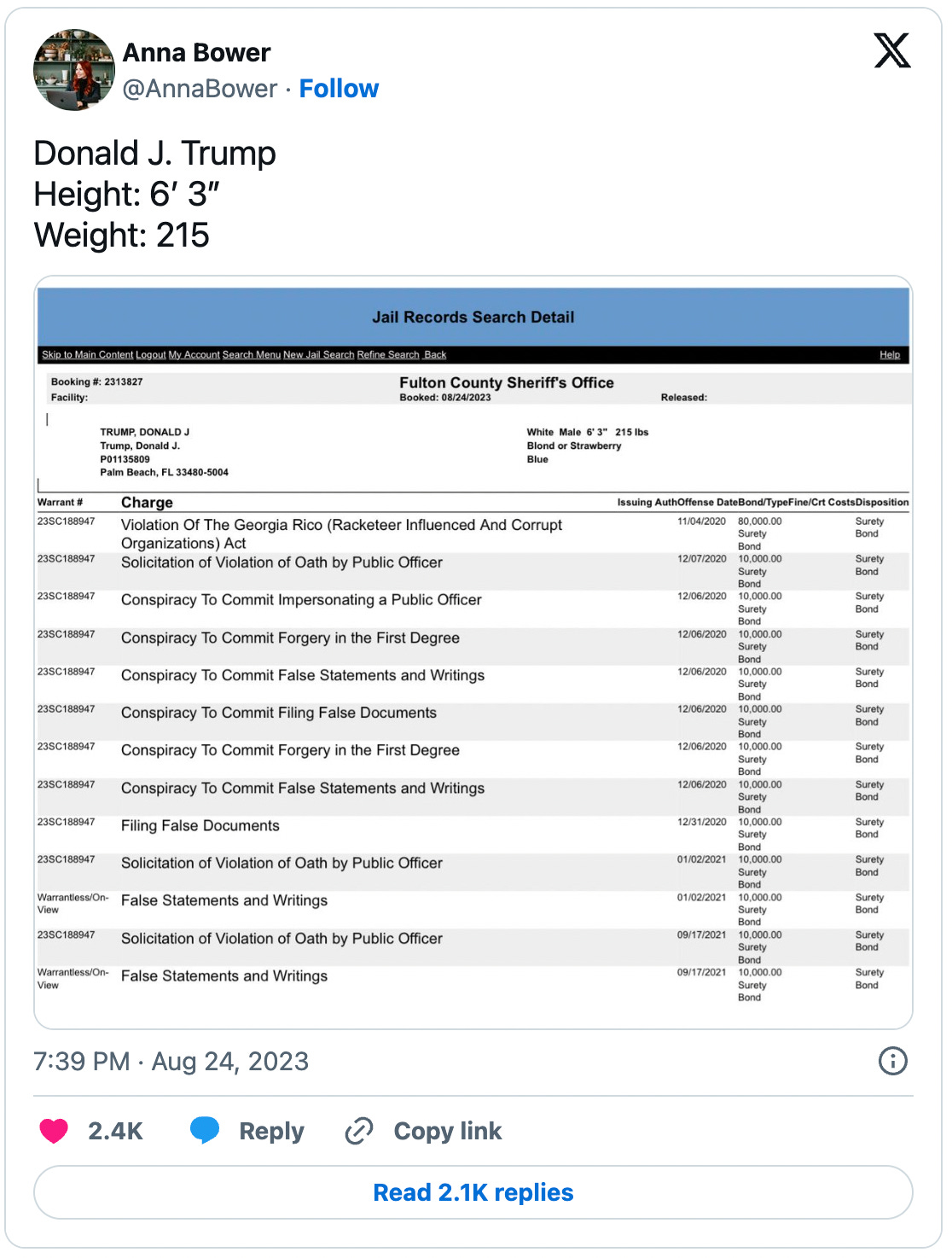 Here’s the first real indication, not just for us, but for Trump, too, that he is a mere mortal. He’s no longer in control. His status is now captured forever in a mug shot—something Jack Smith deferred to Trump on and didn’t make him submit to.