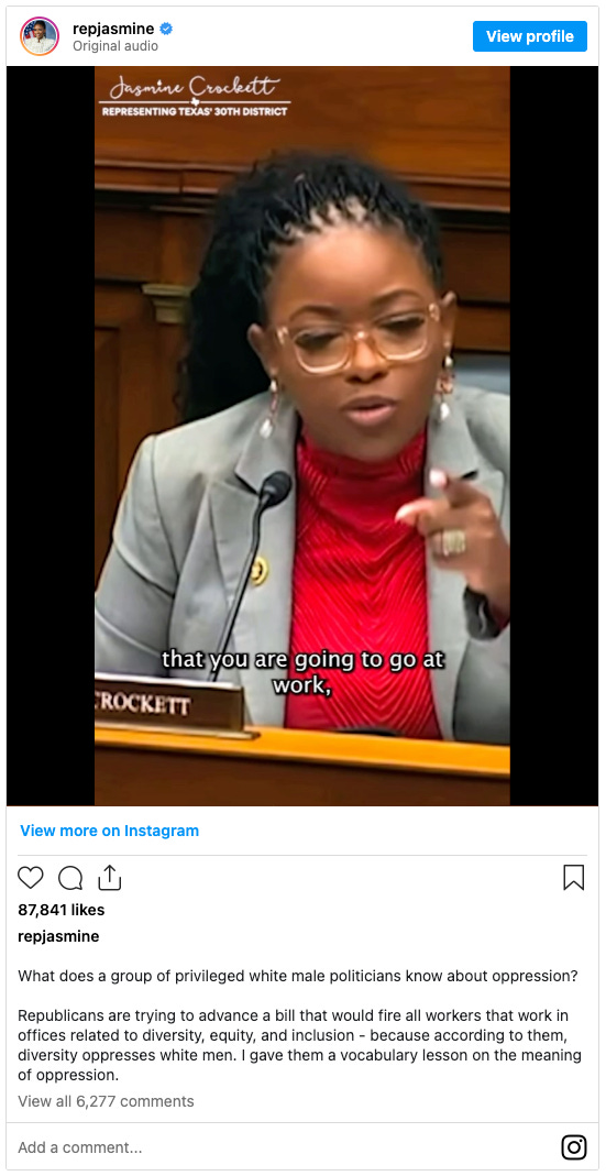 Rep. Jasmine Crockett (D-TX) goes off on Rep. Clay Higgins (R-LA) after he used the word “oppression” during a committee hearing on the “Dismantle DEI Act”: