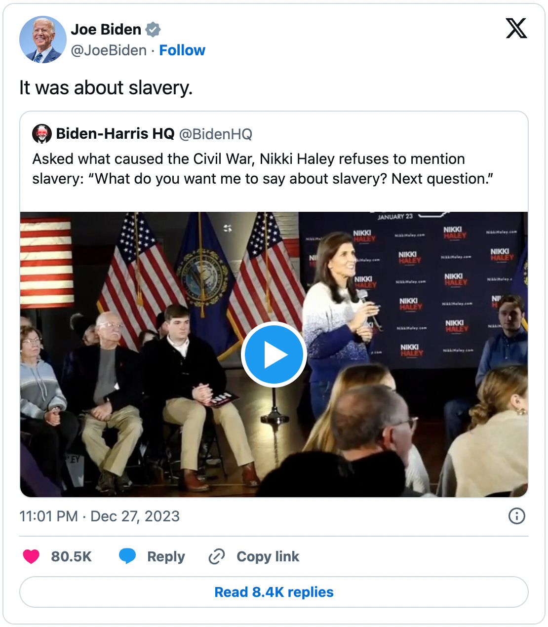 Nikki Haley continues to embarrass herself in trying to preserve the media-bestowed - *cough-cough* - "momentum" by pandering to tRumpy-minded voters whilst courting the "responsible" GOP right-wing. A transparent phony running for a distant second-place finish amongst a field of rank losers...feh!
