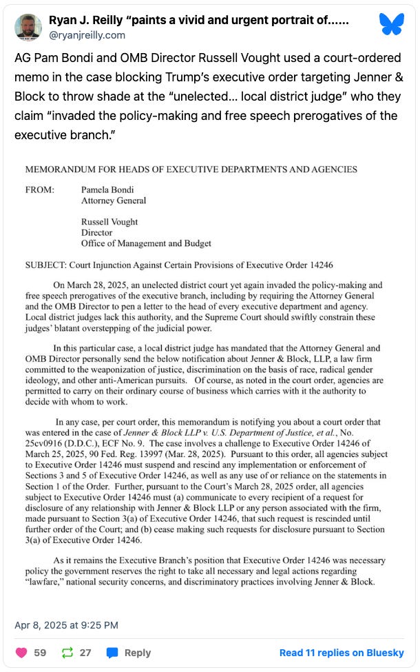 When a federal judge in DC issued a temporary restraining order blocking President Trump’s executive order targeting the Jenner & Block law firm, he directed the administration to give internal notice of his order. This is the snotty notice that went out: